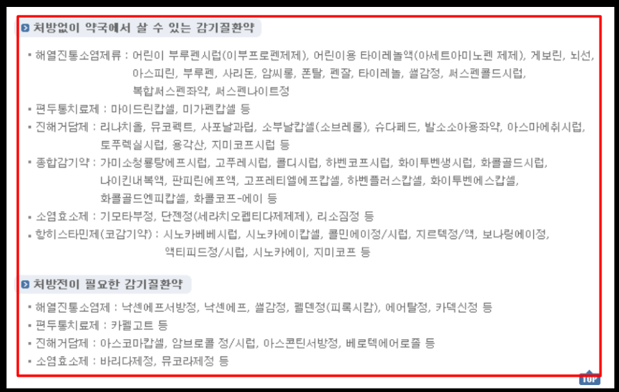 이렇게 처방전없이 약국에서 살 수 있는 감기약 종류가 이렇게 나오는데요, 가운데 보시면 저희가 흔히 알고 있는 타이레놀도 있습니다.
