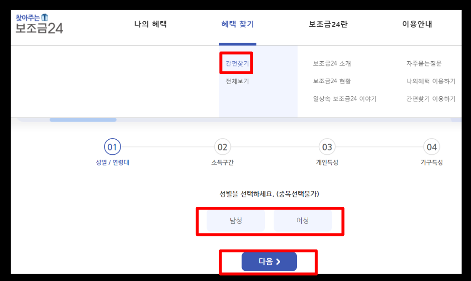 보조금24에서 숨은 정부지원금을 찾으려고 하는데요, 간편하게 하는 방법이 있어서 안내드리려고 합니다. 위에 보시면 혜택 찾기에서 간편 찾기를 누르시면 이렇게 남성, 여성 체크하는 항목이 있습니다. 저는 여자 이기에 여자를 누르고 다음을 눌러줬습니다.