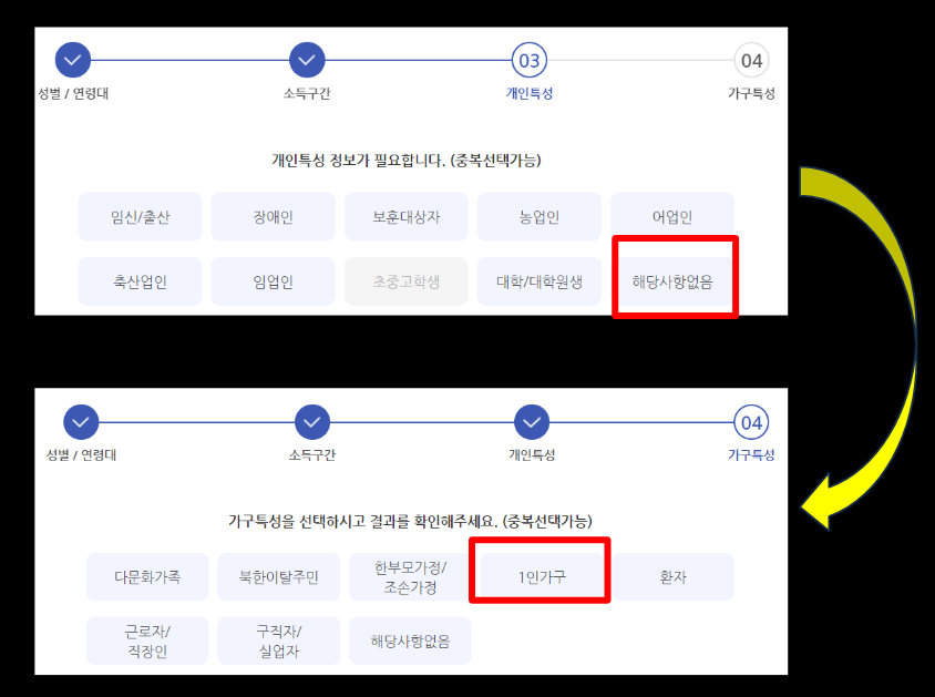 자, 이제는 개인의 특성 정보가 필요한데요, 저는 해당사항이 없는 요즘 1인 가구가 많아진 것처럼 1인 가구를 선택했습니다.