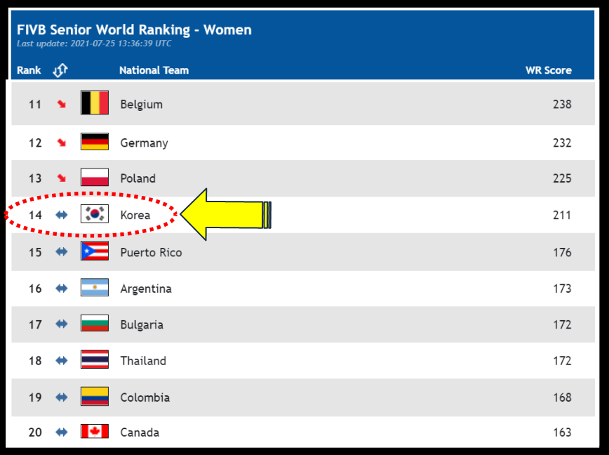 세계 여자 배구 랭킹 2021년 7월 25일 기준 가장 최신판입니다.